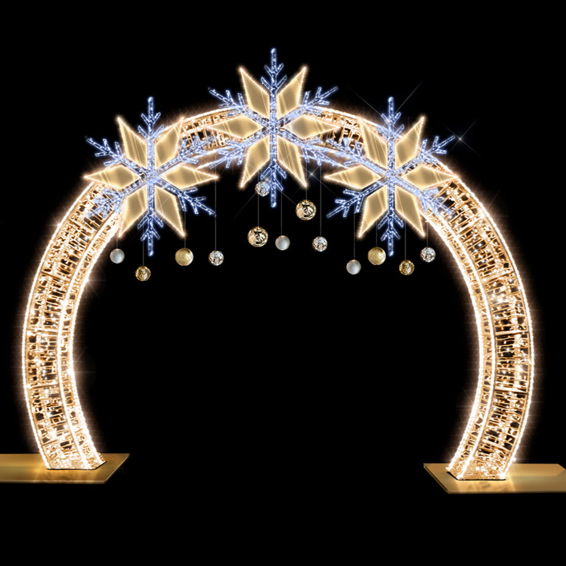 Step into a winter wonderland with the 3D Gate with Three Snowflakes—a dazzling entry feature that transforms any space into a festive focal point. Ideal for municipalities, shopping districts, or commercial plazas, this elegant gateway welcomes visitors with height, symmetry, and seasonal charm.