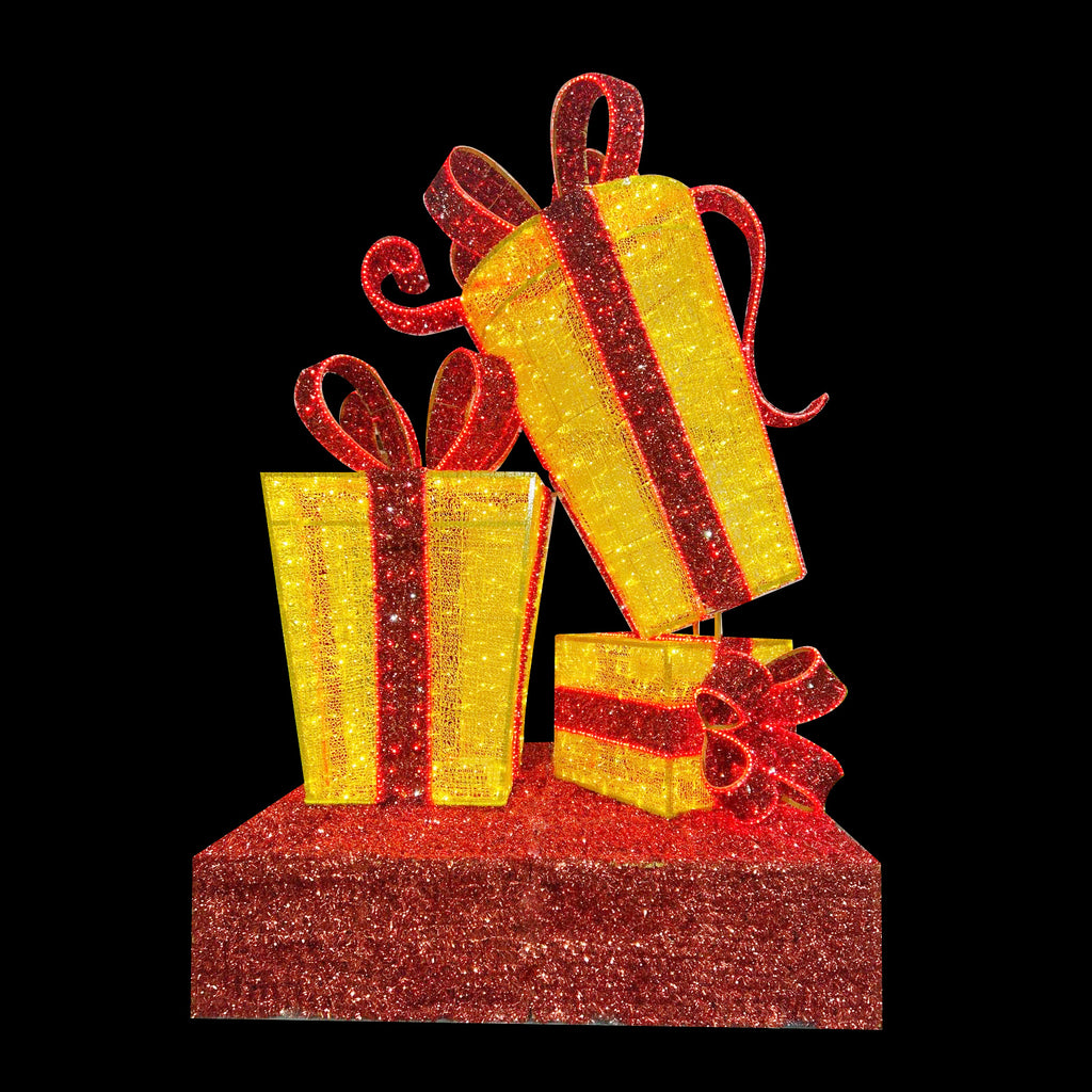 A Tribute to Holiday Cheer The Stacked Gift Boxes installation features three oversized presents arranged in a vertical cascade of light and color. Wrapped in warm gold LED illumination and finished with bold red ribbons and bows, this dazzling piece adds height, charm, and a sense of grandeur to any holiday display.
